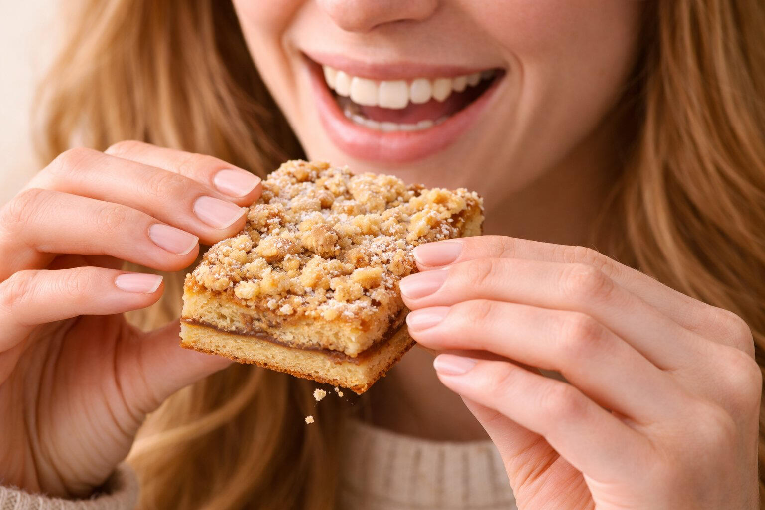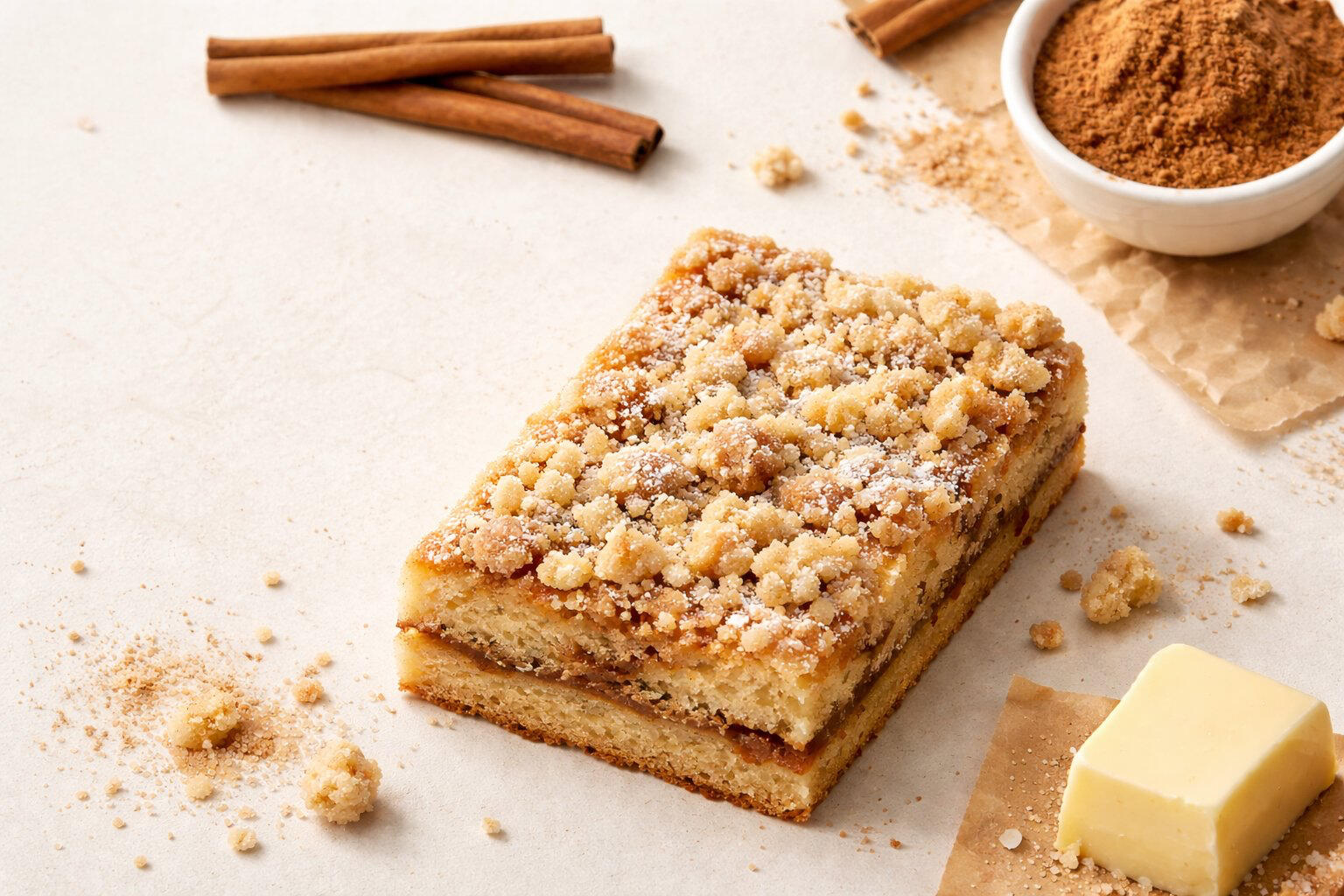 • Texture: Soft crumb with cinnamon ribbon and buttery topping